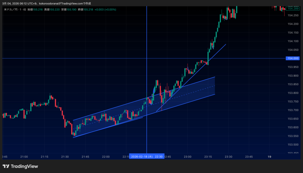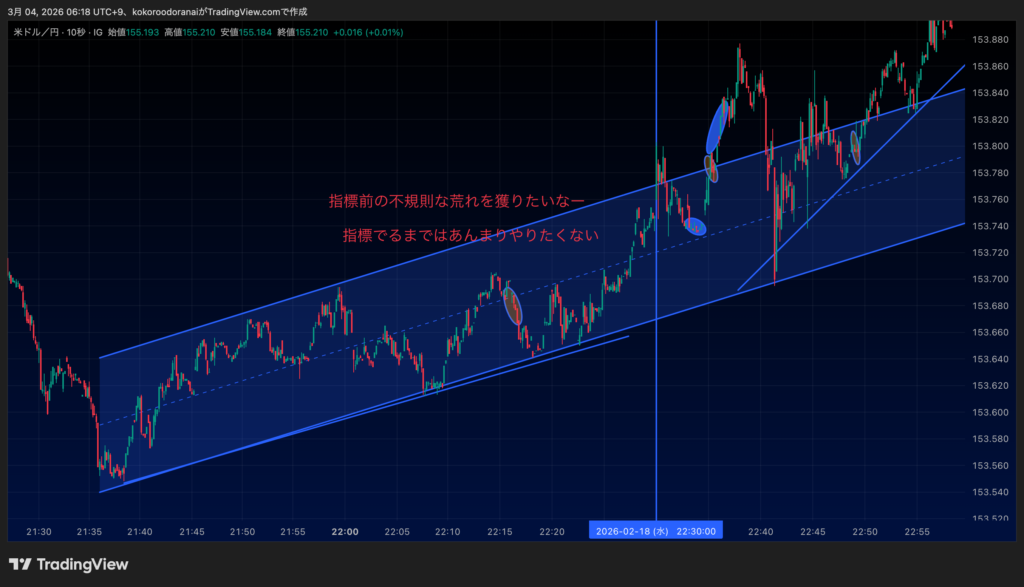 まず前半はチャネル意識ありそうだなーと思いながら22:30の指標を待ってた...と、その前に一回。これはチャネルの中央が直前の動きから意識されていると踏んで一旦跳ねたらショートで入りたいなーと思ってた。そんで陽線で跳ねたところでエントリー。ここはしばらく持ったんでそこそこ獲れた。