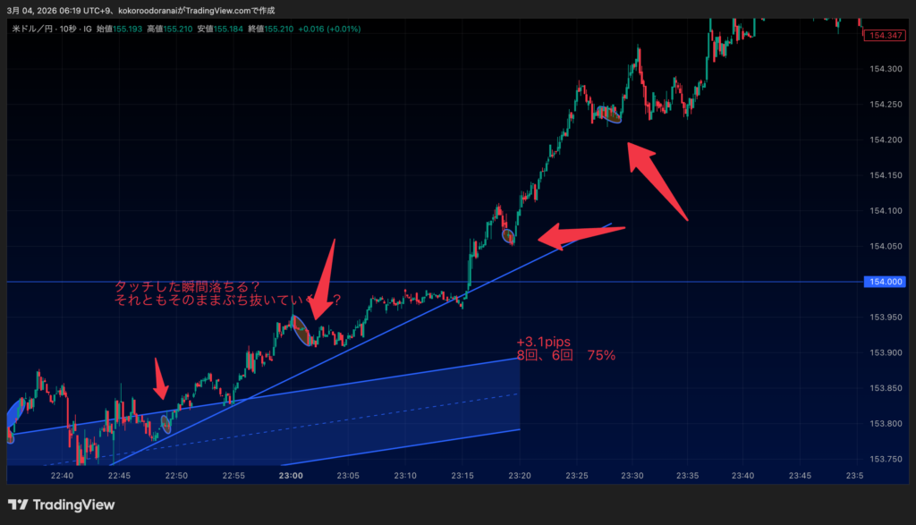 レンジ相場なんかはその方がいいんだけど、トレンド相場だと獲れても少額になりやすい。というか本当にトレンドが強いなら損切りの幅が必然大きくなってペイオフレシオが低くなる。