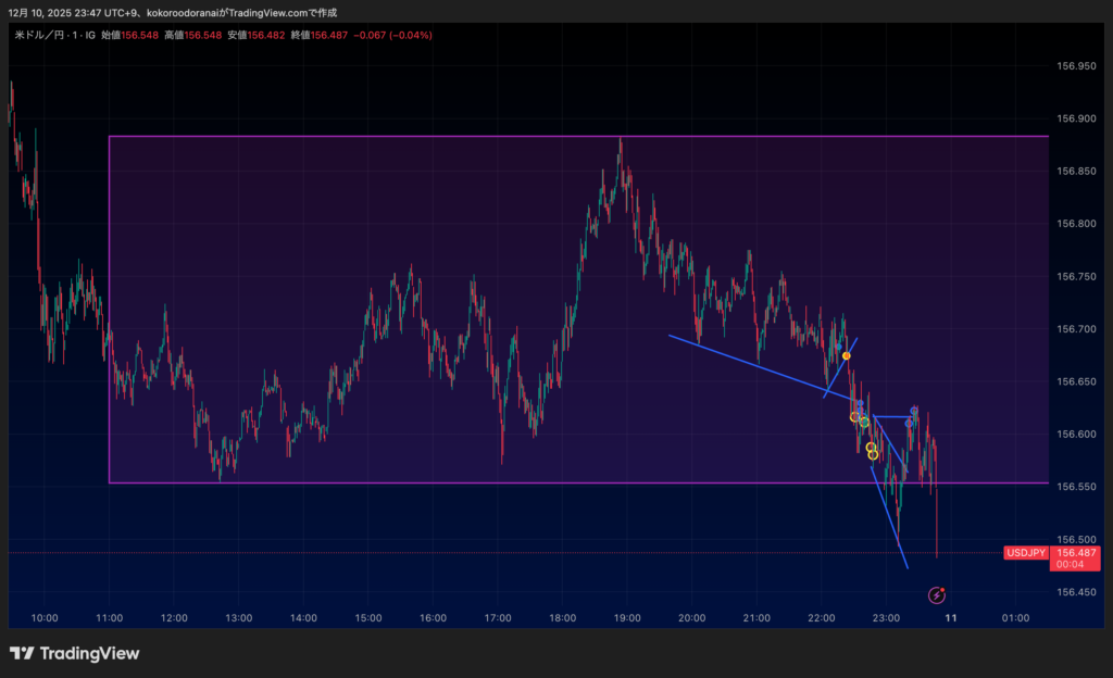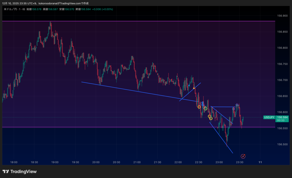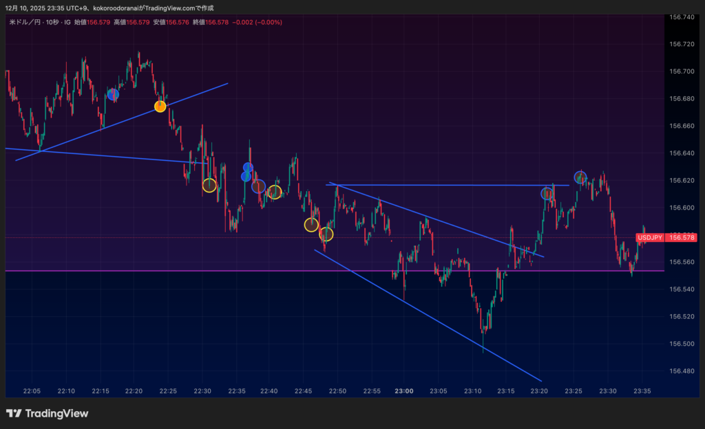 黄色がロング、青がショートでエントリーしたところって感じなんですが、なんか逆張り成分多めで店主は大変気持ち良くなってしまいます。