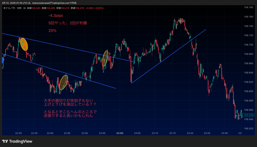 3連目最後にやったのはちょっと訳が違う、まず前提として下落のトレンドラインが意識されそうなのはわかってた。なんだけど直前の上がり具合からこのまま抜いていくんじゃないかなーと思って敢えての逆張りショート、そしたらなんや意識されるんかい!!wwってなって損切り逃げ。