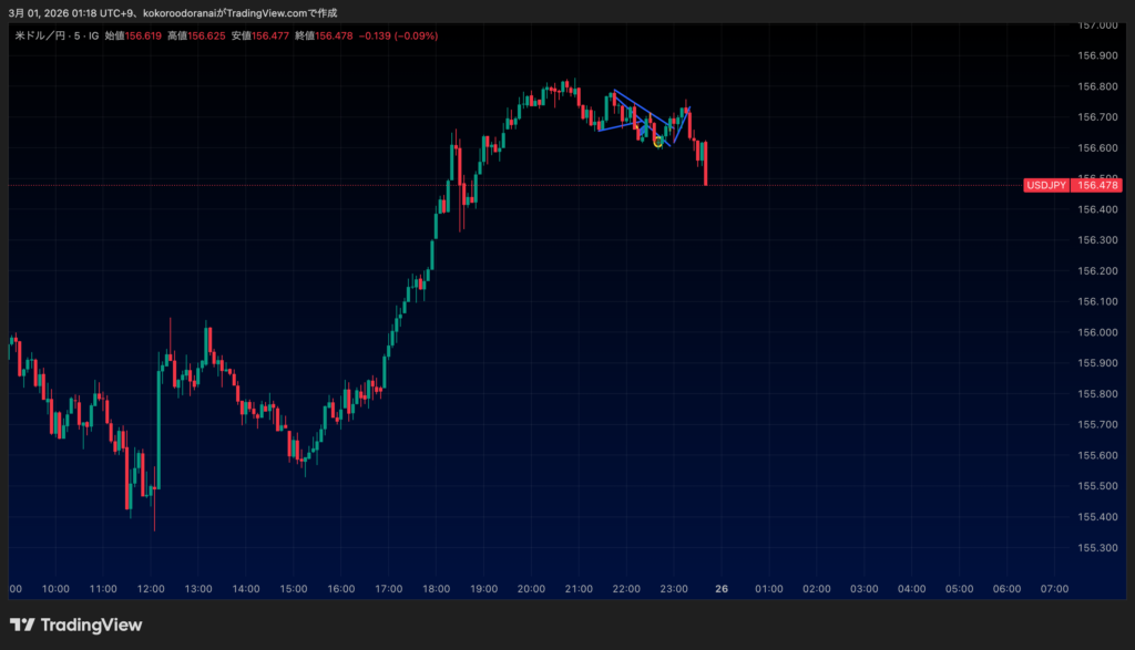 まずは初手の3連敗を一つ一つ解説していく。まずは初手のロングミス...これは後述するけど、ここをレンジと見て跳ね返りを期待して逆張りのロングをしてみたら失敗。ついでこの抜け方(落ち方)はもどってこないかなー?と思って追撃する形で順張りのショート、ここもなんか戻ってきて損切り逃げ。