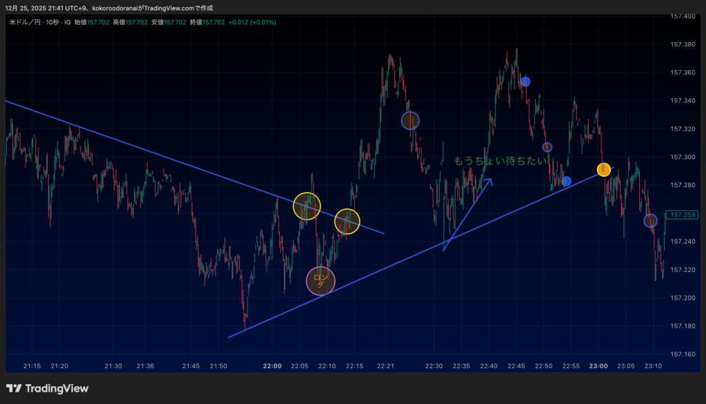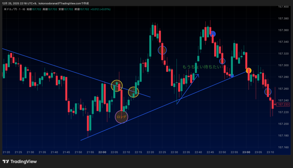 その後のショートは直前のと強い上がりから一服、上げた分だけ戻すパターンを獲りにいった。